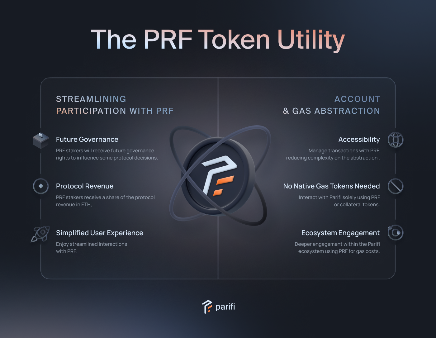 * **No Native Gas Tokens Needed**: By eliminating the need for native chain gas tokens, Parifi users can interact with the protocol solely using PRF or collateral tokens like ETH and USDC, depending on their activities.